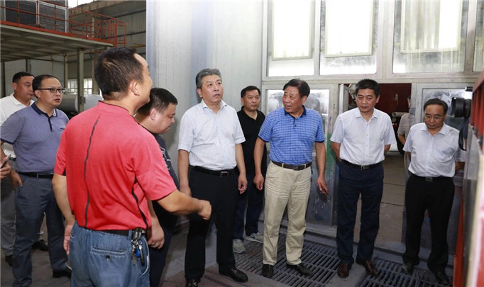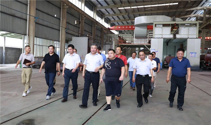 随州市副市长吴超明(前左三)率领市、区环保局的领导及负责人视察程力,现场指导环境整治专项工作,程力程阿罗(前左二)与集团党委书记何儒安(右三)陪同。